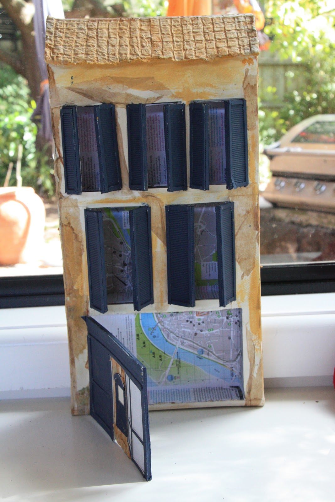 I have made the house using box card, and covered it with paper dyed with tea and caustic soda, then layered with dried teabags and painted.